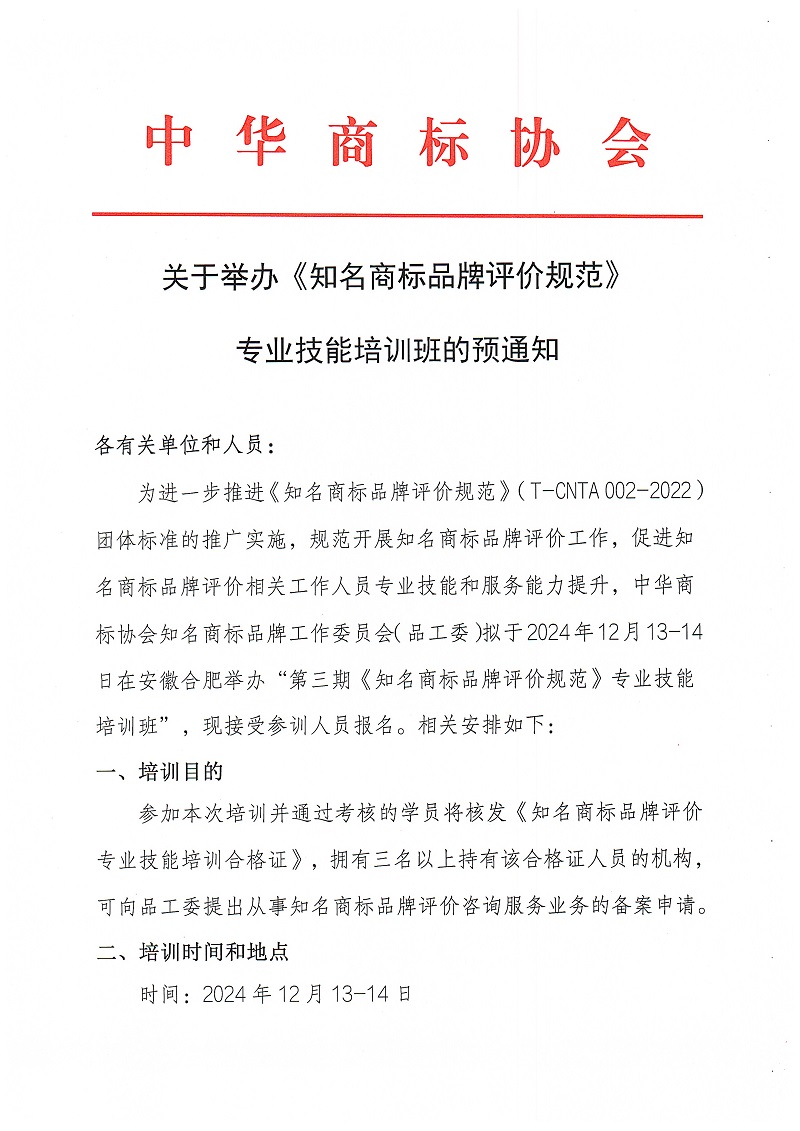 关于举办《知名商标品牌评价规范》,专业技能培训班的预通知