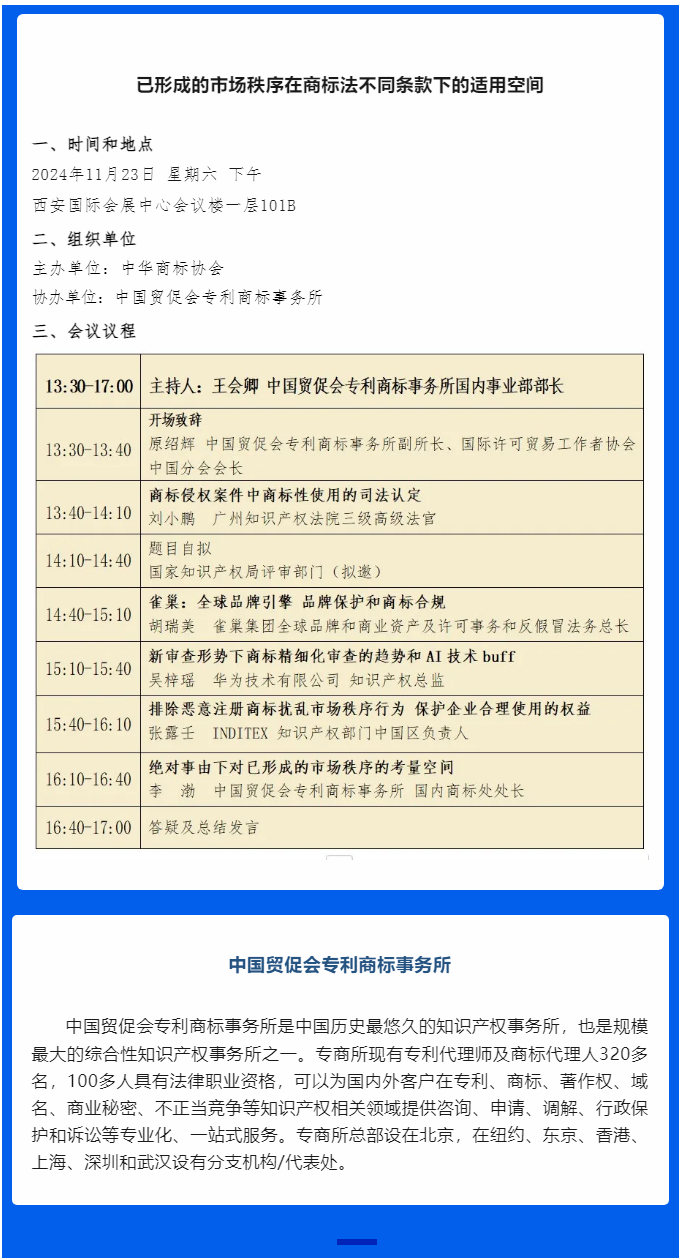 2024中国商标年会 | 会议推介十一:已形成的市场秩序在商标法不同条款下的适用空间