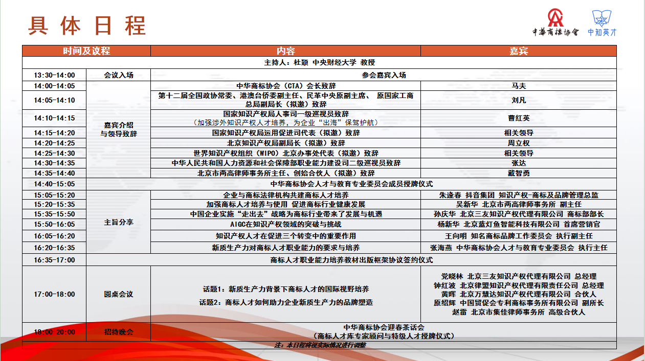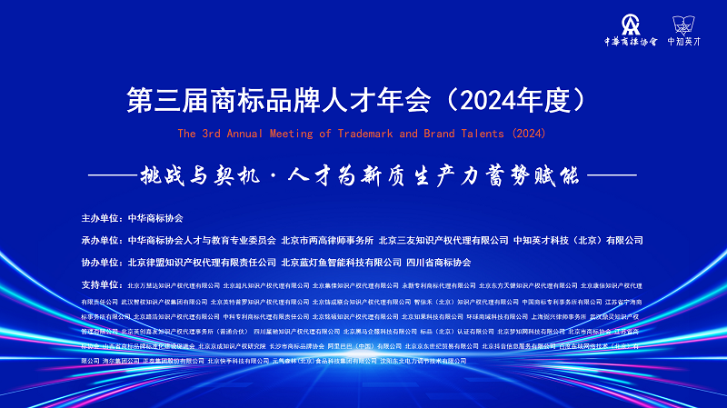 为学习贯彻党的二十届三中全会精神,深入实施知识产权战略,落实《“十四五”国家知识产权保护和运用规划》和《关于分类推进人才评价机制改革的指导意见》,加强商标行业专业人员队伍建设,促进商标行业的健康有序发展,中华商标协会将于2024年12月18日在北京举办第三届商标品牌人才年会(以下简称年会),以“挑战与契机·人才为新质生产力蓄势赋能”为主题,年会立足商标人才发展与“创新、赋能、创收”的基本定位,搭建涵盖增进交流、业务合作、政策研讨、知识分享的年度盛会。