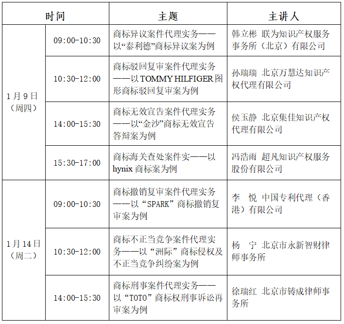 为帮助会员深入了解商标代理典型案例反映的法律问题,促进商标案件代理实务的交流,发挥优秀案例的示范指导作用,我会拟于2025年1月9日、14日举办“商标代理典型案例系列解读培训班”,从入选2022-2023商标代理典型案例中,挑选7个不同案件类型,分两期进行解读和分享。培训相关安排如下: