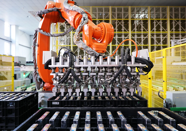 图为2024年11月12日,在柳州国轩电池有限公司,智能协作机械手对电芯进行分档。 新华社记者 金皓原 摄