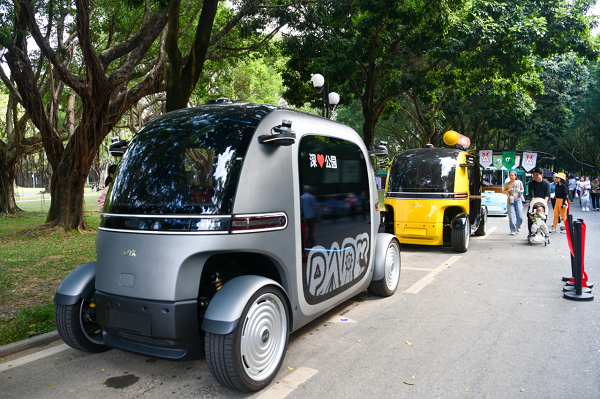 图为2024年11月11日,深圳莲花山公园的无人驾驶观光车、零售车。 新华社记者 梁旭 摄