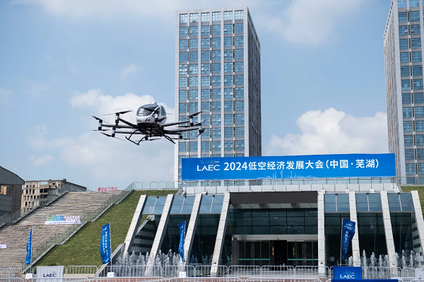 图为2024年9月6日,在安徽省芜湖市,一架低空飞行器在2024低空经济发展大会会场外进行飞行展示。 新华社记者 傅天 摄