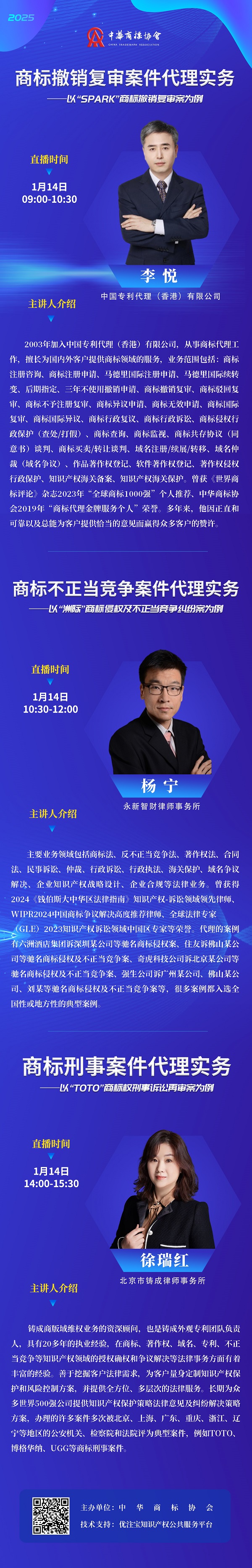 为帮助会员深入了解商标代理典型案例反映的法律问题,促进商标案件代理实务的交流,发挥优秀案例的示范指导作用,我会拟于2025年1月9日、14日举办“商标代理典型案例系列解读培训班”,从入选2022-2023商标代理典型案例中,挑选7个不同案件类型,分两期进行解读和分享。第一期已于1月9日成功举办,现将第二期培训相关安排如下: