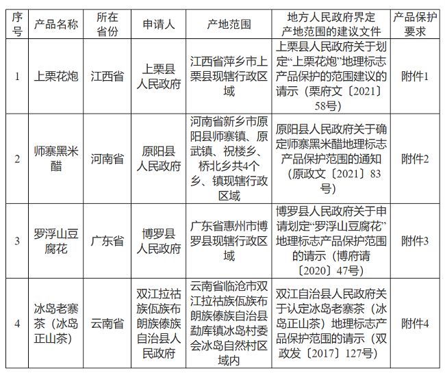 根据《地理标志产品保护办法》有关规定,国家知识产权局对上栗花炮、师寨黑米醋、罗浮山豆腐花、冰岛老寨茶(冰岛正山茶)等4个产品予以地理标志产品初步认定,现予公告。