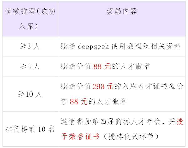 为完善人才评价体系,推动人才聚集,促进商标人才队伍高质量发展,本次申报计划开展“荐才有礼”活动,具体奖励标准如下: