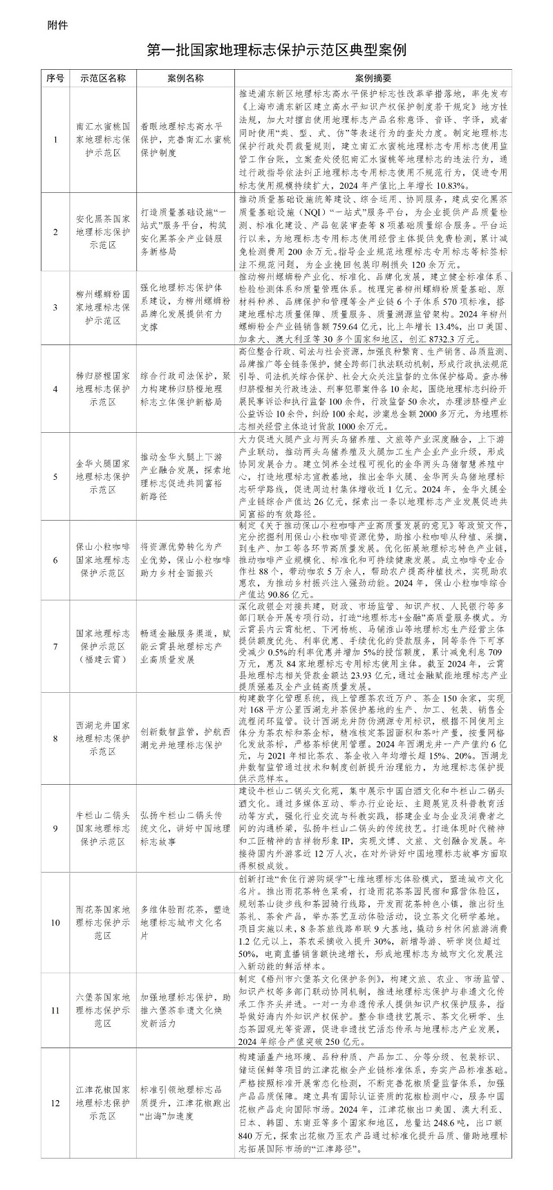 为推进国家地理标志保护示范区建设,充分发挥示范创建引领作用,进一步探索形成地理标志保护服务区域经济高质量发展的新路径。按照《国家知识产权局办公室关于征集国家地理标志产品保护示范区典型案例的通知》(国知办函保字〔2024〕884号),经组织申报、地方推荐、专家评审、综合评审等环节,确定了12个创新性强、成效较为突出、具备复制推广价值的案例,作为第一批国家地理标志保护示范区典型案例。