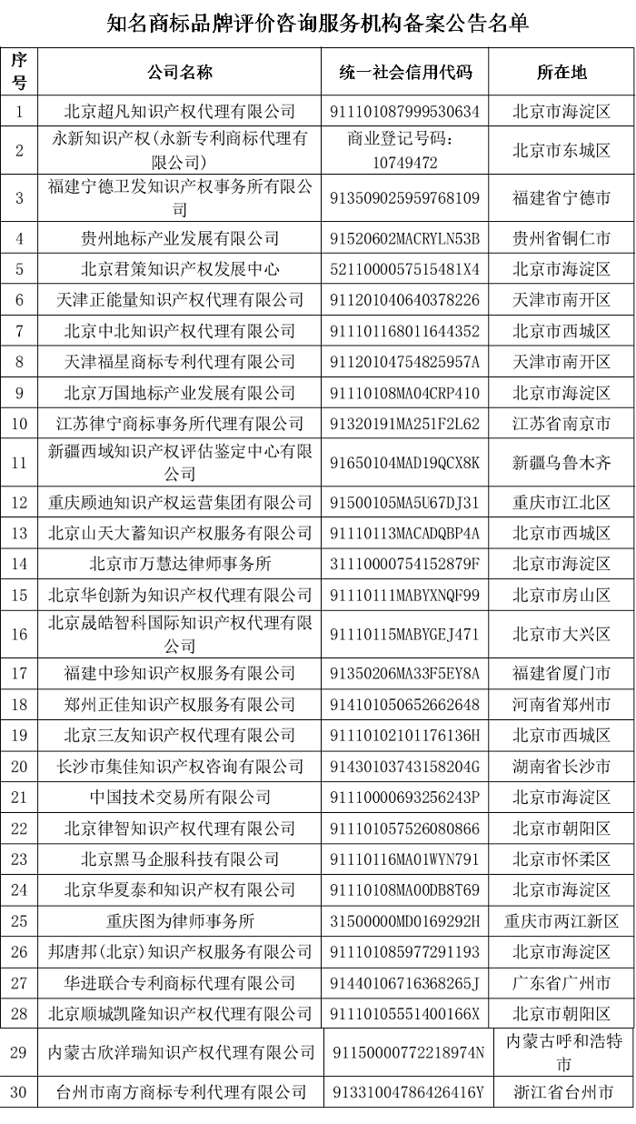根据中华商标协会《知名商标品牌评价工作管理办法》《知名商标品牌评价咨询服务机构备案管理办法》有关规定,以下知名商标品牌评价咨询服务机构在2024年7月2日至2024年7月7日公示期内未收到异议反馈,符合从事知名商标品牌评价咨询服务工作备案条件,现予公告。