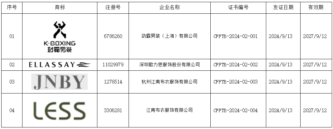 下列商标品牌经公示无异议,通过服装服饰知名商标品牌评价,授予服装服饰知名商标品牌证书: