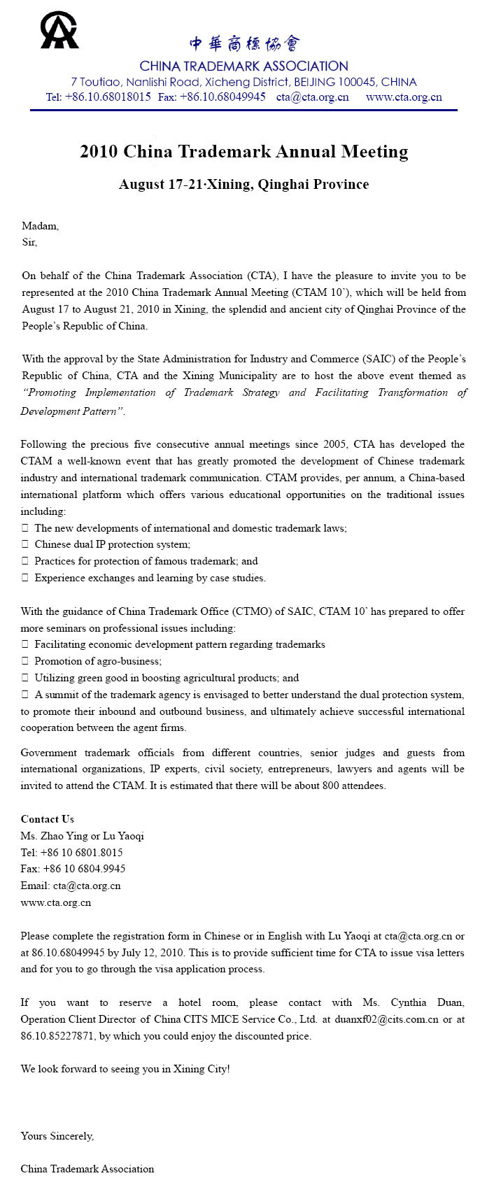 Enclosures: ⅠRegistration Form of the 2010 China Trademark Annual MeetingⅡDraft Agenda of the 2010 China Trademark Annual Meeting