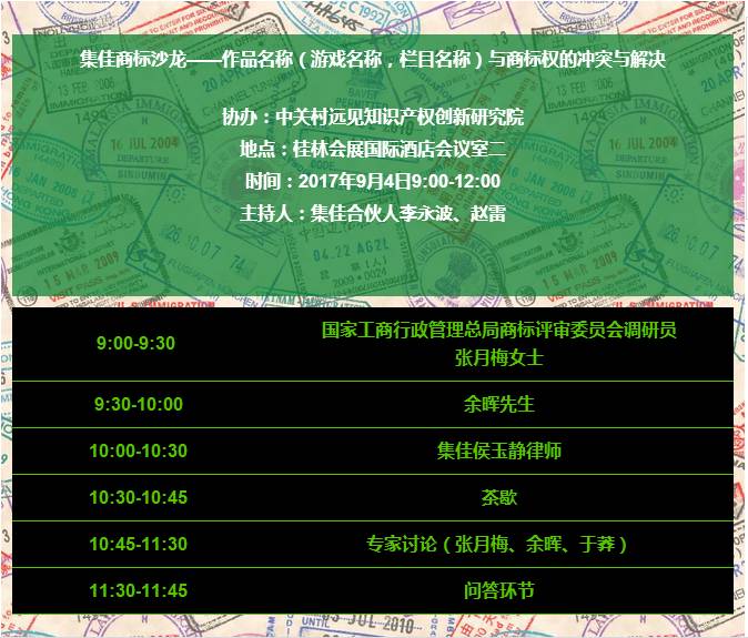 9月4日,“集佳商标沙龙——作品名称(游戏名称,栏目名称)与商标权的冲突与解决”将在桂林会展国际酒店举办,具体日程如下。