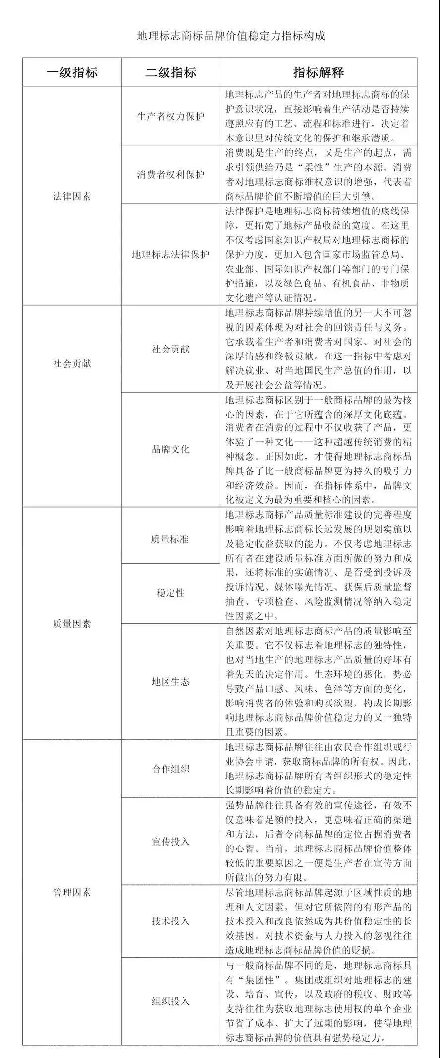 地理标志商标品牌价值稳定力指标是衡量地理标志商标品牌持续发挥作用的能力。它由4个大类指标、12个细类指标所组成。在影响品牌价值长期效力的一般因素基础上,重点考察地理标志商标品牌的历史文化贡献、合作组织情况、政府或合作组织投入、地区生态等变量。稳定力指标通过分析后经计算而成,体现了地理标志商标品牌在价值创造方面的持续力量。