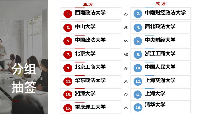 随后,在抽签环节中,主持人汪泽介绍了抽签分组的规则和流程。抽签工作分为两项,一是抽取比赛对阵分组,二是抽取首轮比赛的题目顺序。本届比赛将通过淘汰赛的方式,最终决出冠亚军,初赛通过抽签的方式确定分组。在对阵分组环节,马夫和白刚分别抽取了比赛的正方和反方,对阵结果如下:
