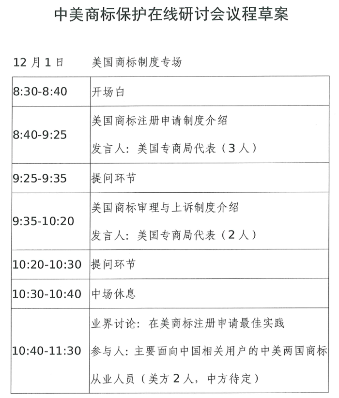 为进一步宣传我国商标法律制度,交流分享商标法律案件的经验,增进彼此相互理解,国家知识产权局计划于12月1日上午与美国专利商标局共同举办商标保护研讨会(下称“研讨会”)。研讨会采用视频会议形式进行,拟邀请中美两国相关政府机构和法律界代表,各自介绍中美两国商标法律体系和保护实践有关情况及最新进展,面向中国用户介绍美国商标注册申请、后续程序以及最佳实践。会议提供中英文同传。具体事项如下: