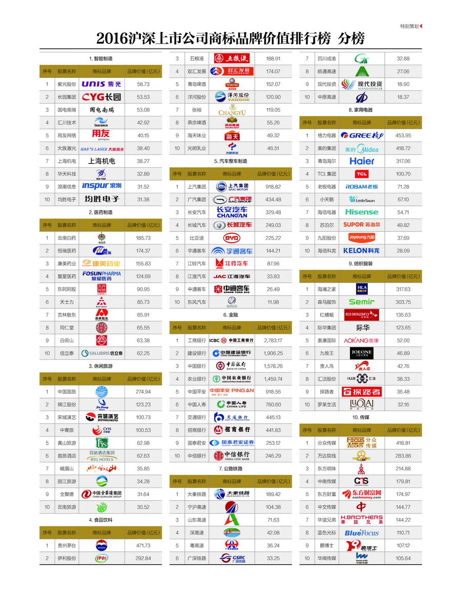 十大行业上市公司商标品牌价值分榜“十强”