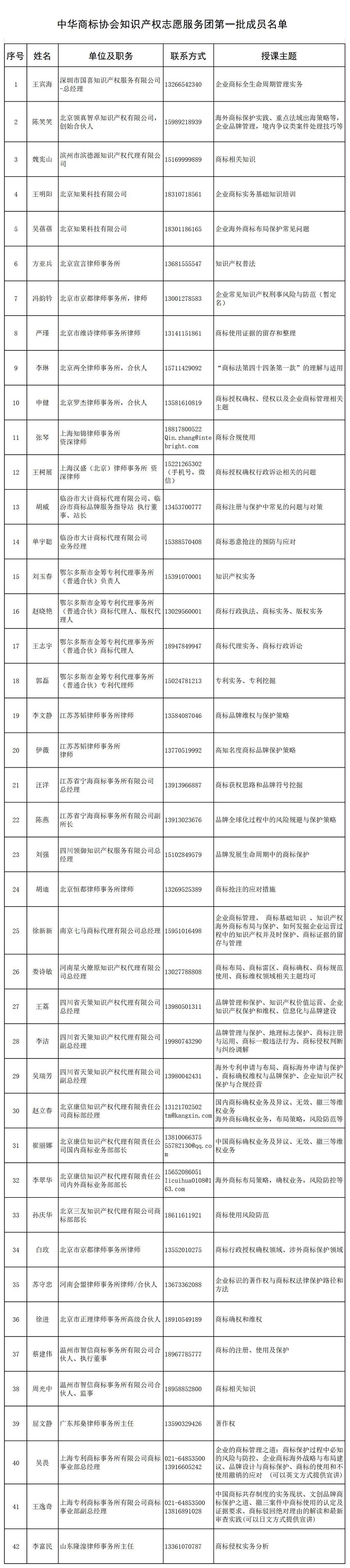 附件:中华商标协会知识产权志愿服务团第一批成员名单 (按报名时间顺序排列)