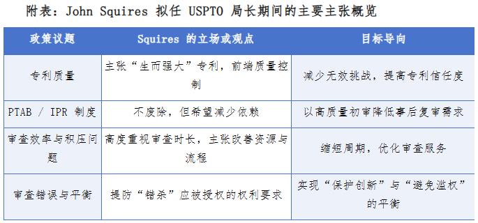虽然Squires 并未呼吁废除专利审判与上诉委员会(PTAB)或 IPR 程序,但他明确表达了希望通过提升专利授权质量,降低对这些后端审查程序的依赖。