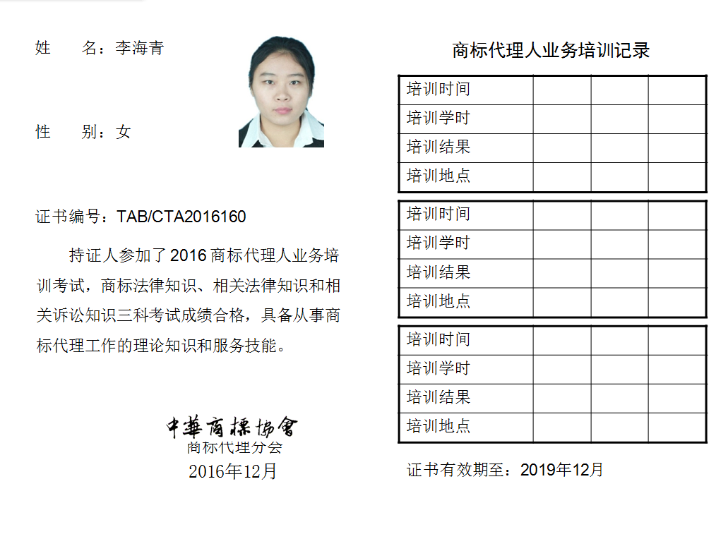 首页 > 代理分会 > 合格证书查询 > 2016年商标代理人业务培训考试合格证书 > 北京铸成联合知识产权代理有限公司