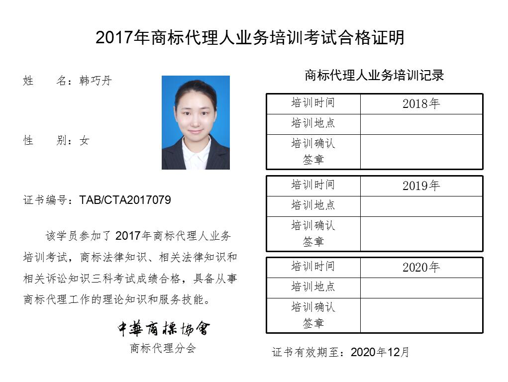 首页 > 代理分会 > 合格证书查询 > 2017年商标代理人业务培训考试合格证书 > 江苏省宁海商标事务所有限公司