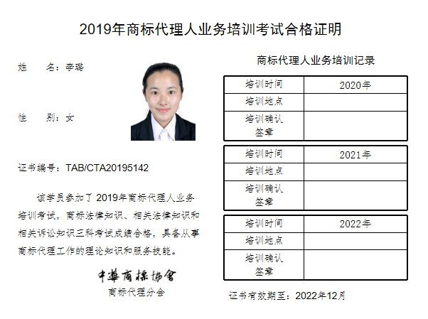 首页 > 代理分会 > 合格证书查询 > 2019年商标代理人业务培训考试合格证书 > 北京律盟知识产权代理有限责任公司