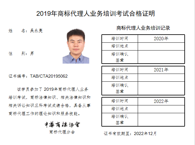 首页 > 代理分会 > 合格证书查询 > 2019年商标代理人业务培训考试合格证书 > 北京天玺泽知识产权代理有限公司
