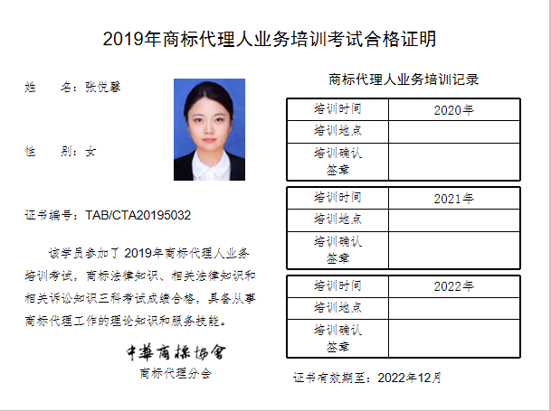 首页 > 代理分会 > 合格证书查询 > 2019年商标代理人业务培训考试合格证书 > 北京英创嘉友知识产权代理事务所(普通合伙)
