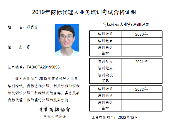 首页 > 代理分会 > 合格证书查询 > 2019年商标代理人业务培训考试合格证书 > 山东方宇商标事务所有限公司
