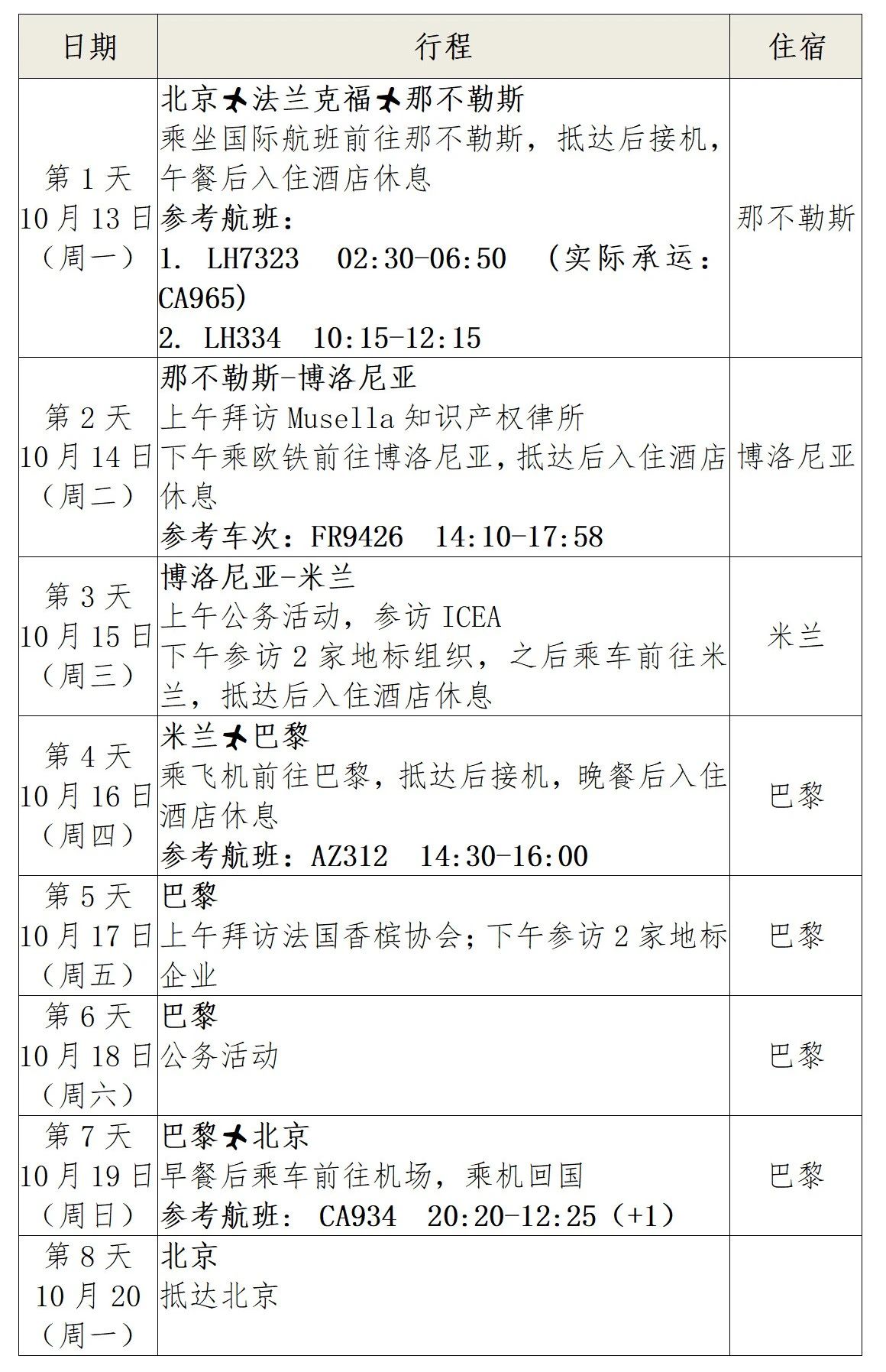 法国是全球地理标志保护制度的起源国,拥有完善的地理标志保护制度;意大利是农产品原产地名称和地理标志被欧盟认可最多的欧洲国家,也是《中欧地理标志保护与合作协定》中产品数量最多的欧盟国家。金秋十月,我会将由吴东平副会长兼秘书长率代表团赴意大利和法国,考察两国地理标志保护运用制度和实践,以期通过深入学习交流,为国内地理标志工作提供有益借鉴。考察活动具体安排如下: