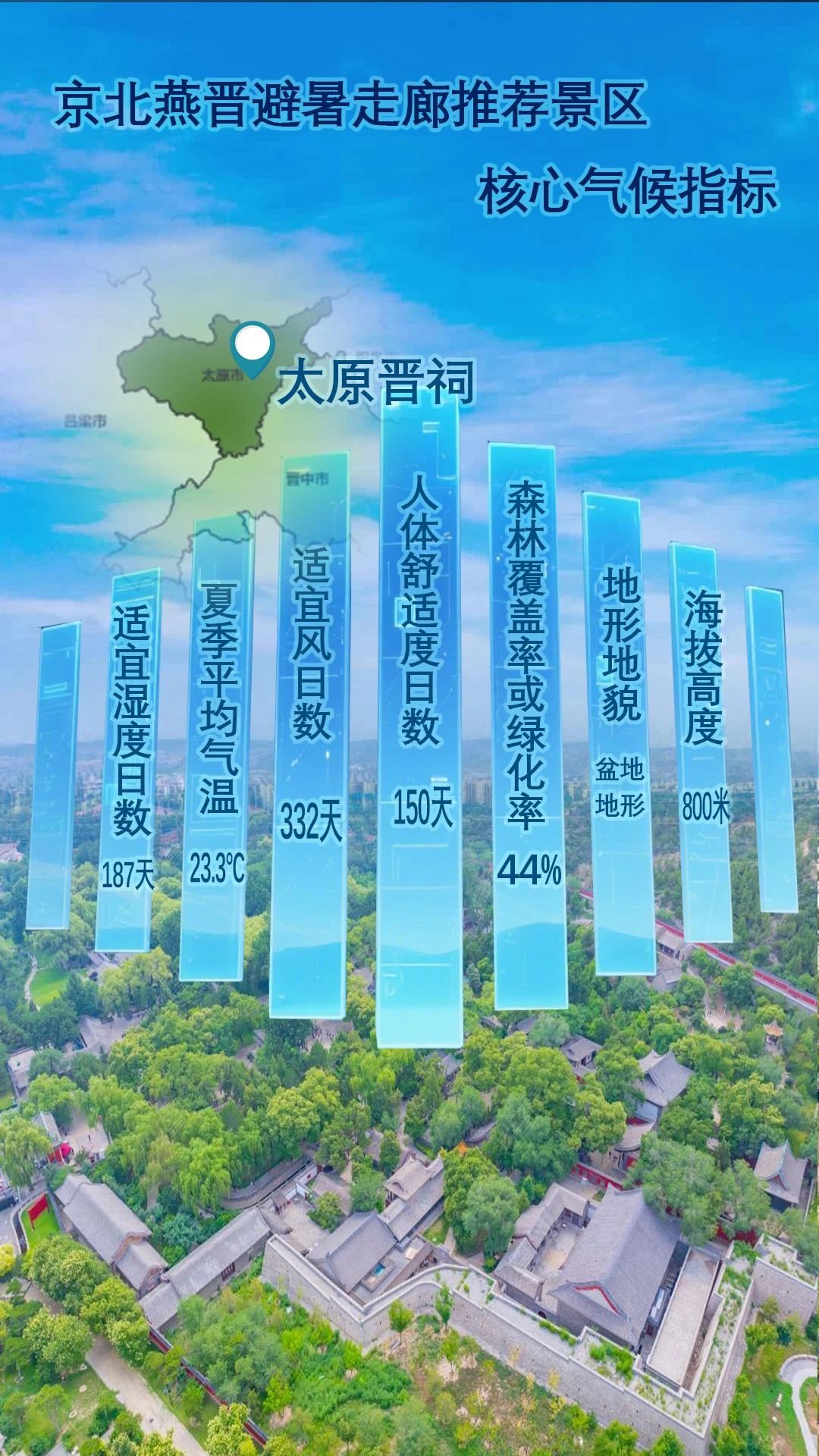 太原晋祠是晋水的发源地,难老泉潺潺流水环绕,带来湿润凉意,园内120余种树木绿意盎然,遮阳降温,古建群错落有致,其厚实墙体与高大屋檐阻挡烈日,营造出大片阴凉。