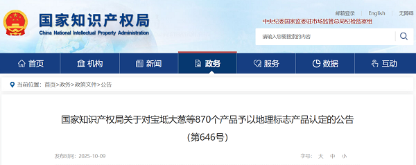 国知局丨关于对宝坻大葱等870个产品予以地理标志产品认定的公告