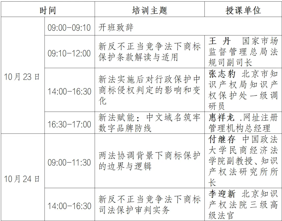 今年6月27日,十四届全国人大常委会第十六次会议通过了反不正当竞争法修订草案。新修订的反不正当竞争法将于10月15日起施行。为帮助广大会员精准把握新法有关商标保护条款的修改重点,有效提升应对商标与反不正当竞争问题的专业能力,由中华商标协会主办、北龙中网协办的“新反不正当竞争法下商标保护实务培训班”拟于10月23-24日在北京举办。培训相关安排如下: