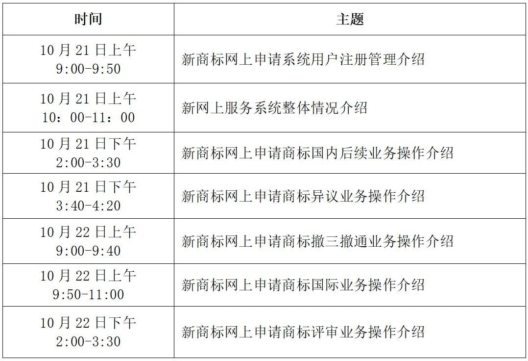 新商标网上申请系统于2025年10月20日正式开通运行,为让申请人、商标代理及其他社会公众熟悉系统变化及操作流程,国家知识产权局商标局已于10月21日至22日开展线上直播授课,具体培训内容如下: