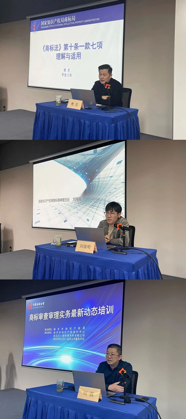 本次培训邀请到国家知识产权局商标局审查三处三级调研员樊昊、审查五处二级主任科员刘瑞明、审查七处一级调研员刘强三位审查部门骨干就商标带有欺骗性商标禁用审查、撤三审查以及集证商标、地理标志商标审查实务展开授课。樊昊聚焦《商标法》第十条第一款第七项误认条款,结合典型案例解析“欺骗性” 与 “误认” 的构成要件,为学员解析审查尺度;刘瑞明系统讲解了集体商标、证明商标的法律特征、审查标准与实操流程,重点阐释地理标志相关商标的特殊审查要求;刘强介绍了2025 年撤三审查制度改革的最新动态,撤三申请要求及变化,特别是审查要点。课程内容紧扣行业热点、贴合实务需求,对今后开展相关工作具有重要的指导意义,获得了参训学员的一致好评。