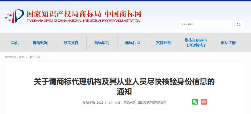 为进一步规范商标代理行为、加强商标代理行业监管,自2025年10月20日起,所有在我局办理商标业务的商标代理机构及其从业人员均需核验身份信息。现将有关事项通知如下: