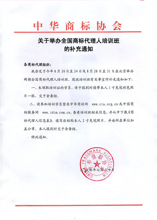我会定于今年 8月20日至24日及8月28日至31日在 北京举办两期全国商标代理培训班,现就培训班有关 事宜作补充通知如下: