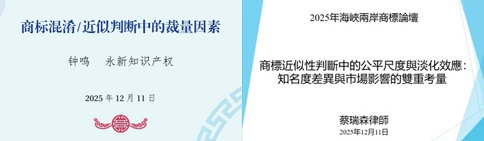 永新知识产权高级顾问钟鸣、理律法律事务所合伙律师蔡瑞森分别就《商标混淆/近似判断中的裁量因素》和《商标近似性判断中的公平尺度与淡化效应:知名度差异与市场影响的双重考量》进行分享。