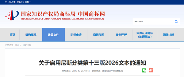 广而告之 | 国家知识产权局商标局关于启用尼斯分类第十三版2026文本的通知