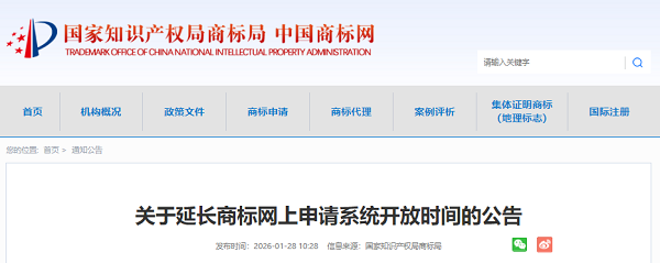 商标局丨关于延长商标网上申请系统开放时间的公告