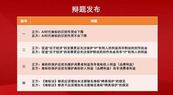 在本届辩论赛的前期筹备阶段,组委会面向社会征集并发起公众投票的辩题共36个,结合投票结果,组委会初步选定并会同有关专家共同研究后,最终确定了本届辩论赛的四个比赛用题,由中华商标协会宣传部部长兼研究室主任、《中华商标》杂志主编臧文如发布。