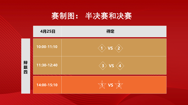 半决赛和决赛在一个比赛日内先后举行,使用辩题四;半决赛后,晋级决赛的赛队重新抽签确定对阵的正、反双方,题目不变。