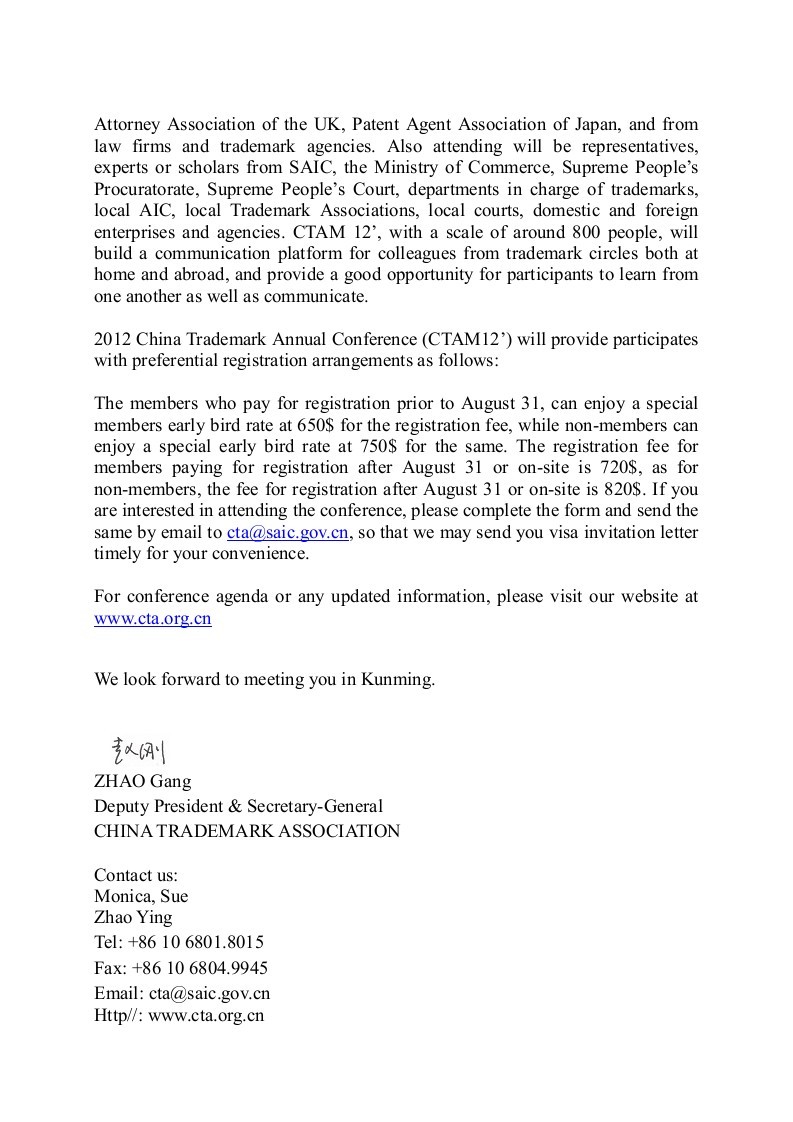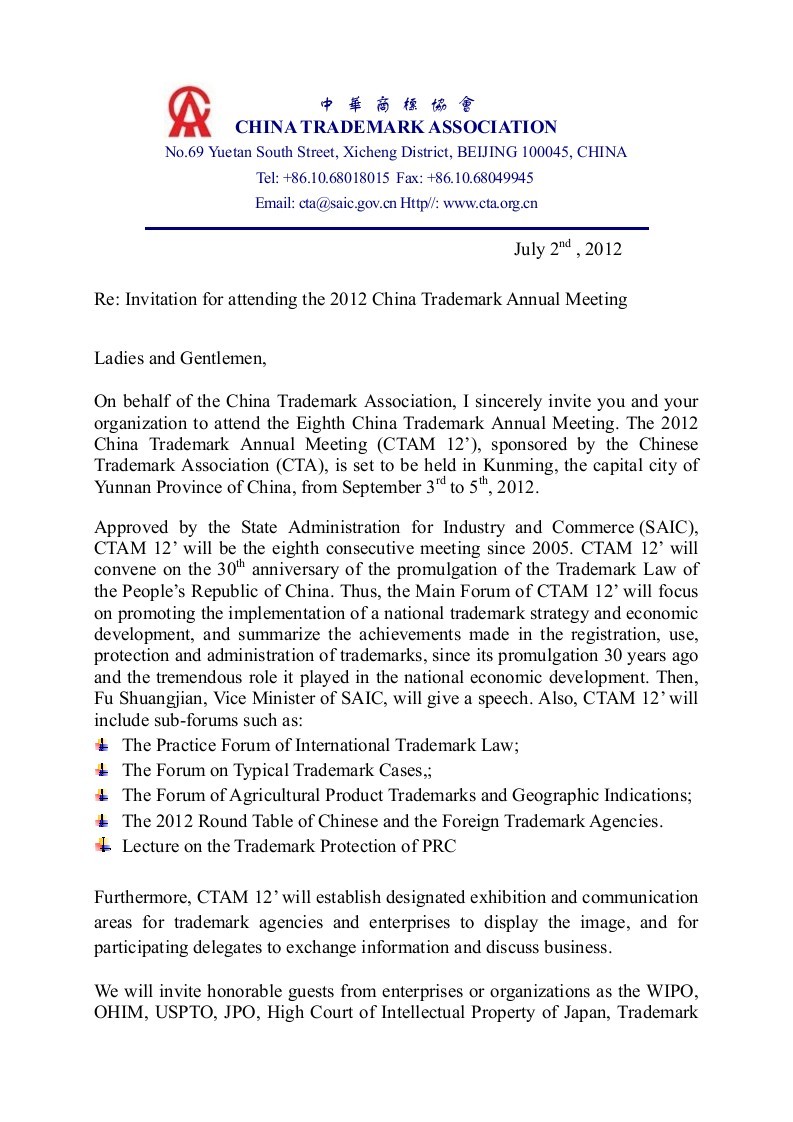 Invitation for attending the 2012 China Trademark Annual Meeting
