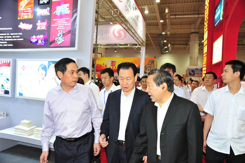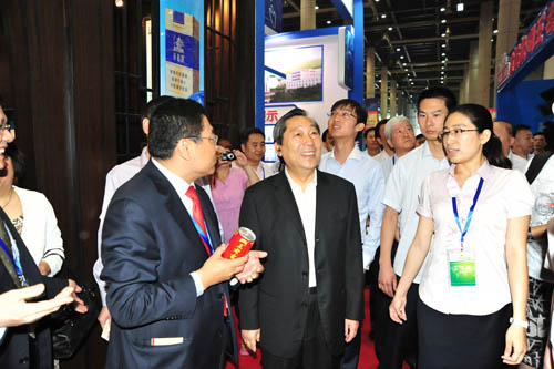 2013年6月14日上午,国家工商总局刘俊臣副局长(前排左)、中华商标协会刘凡会长(前排中)陪同全国政协齐续春副主席(前排右)参观2013中国(大连)驰名商标及地理标志精品博览会