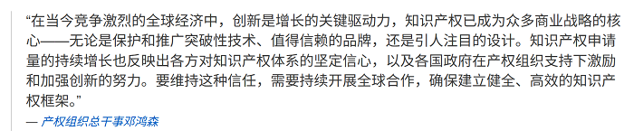 产权组织总干事邓鸿森指出,这些数字表明,知识产权对商业和经济增长依然十分重要: