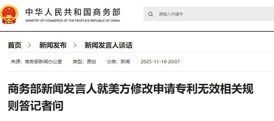 商务部新闻发言人就美方修改申请专利无效相关规则答记者问