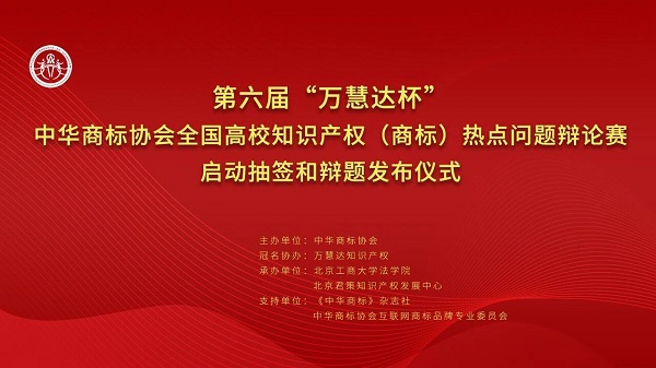 3月13日,第六届“万慧达杯”中华商标协会全国高校知识产权(商标)热点问题辩论赛启动抽签和辩题发布仪式在京成功举办。本届辩论赛由中华商标协会主办,万慧达知识产权冠名协办,北京工商大学法学院和北京君策知识产权发展中心承办,《中华商标》杂志社和中华商标协会互联网商标品牌专业委员会共同作为支持单位。