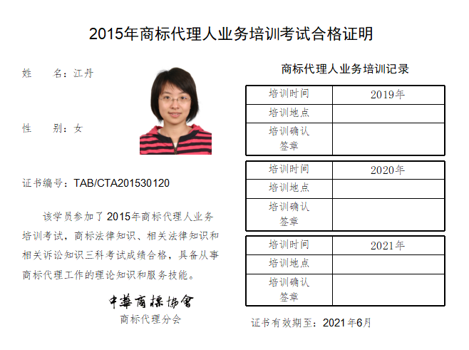 2015年商标代理人业务培训考试合格证书