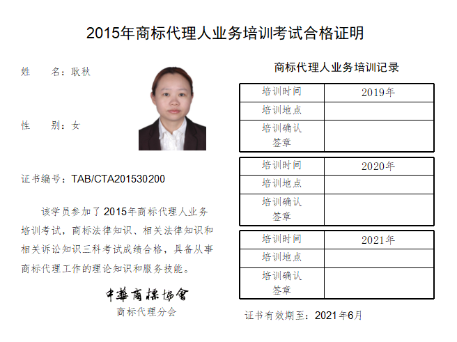 2015年商标代理人业务培训考试合格证书