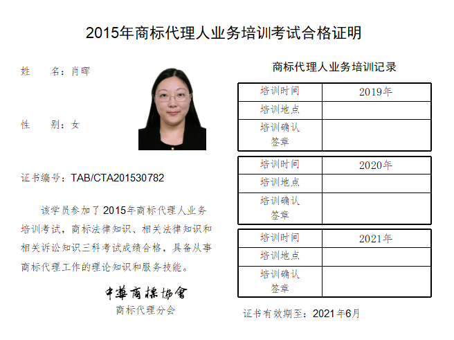 2015年商标代理人业务培训考试合格证书