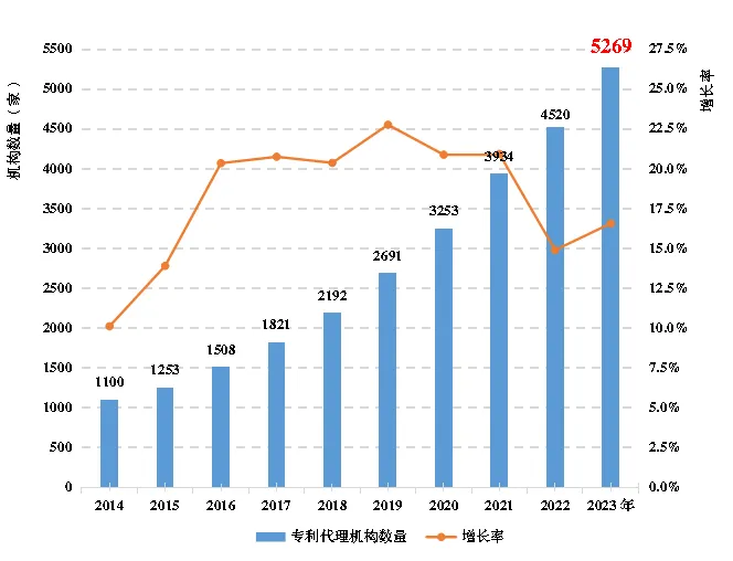 图1展示了2014-2023年我国专利代理机构数量变化情况。截至2023年底,专利代理机构总量达到5269家,同比增长16.6%。