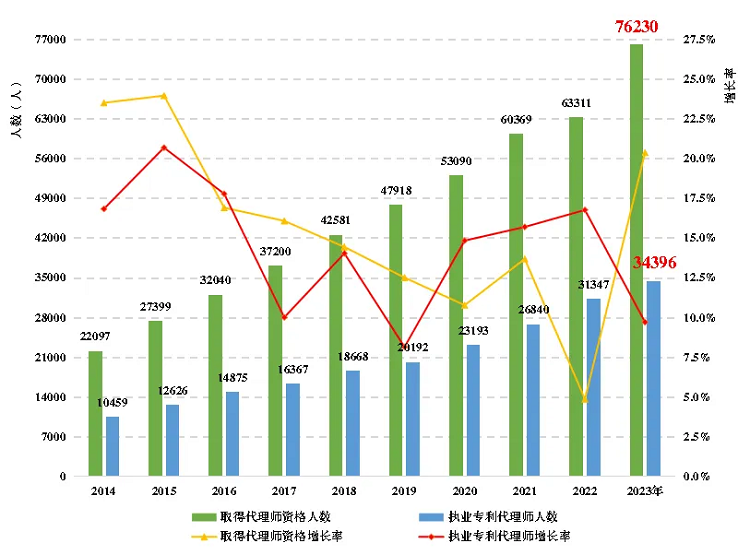 随着我国专利申请量和专利代理业务需求的增长,专利代理人才队伍不断壮大,截至2023年底,我国执业专利代理师已达到34396人。